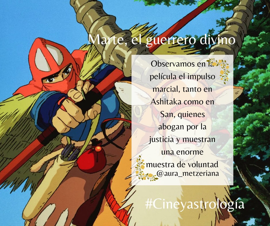 Observamos que la película transcurre en un contexto sumamente bélico, es aquí donde en esta obra maestra de Hayao Miyazaki, observamos la dualidad de Marte, mientras en la luz es representado por Ashitaka, quien no lucha innecesariamente, escoge de manera estratégica sus batallas pero no duda en tomar acción cuando se trata de defender a los inocentes, notamos un personaje imparcial que, después de ser maldecido por un dios/demonio, se ve obligado a emprender el camino del héroe, acompañado únicamente por Yakul, su fiel compañero.