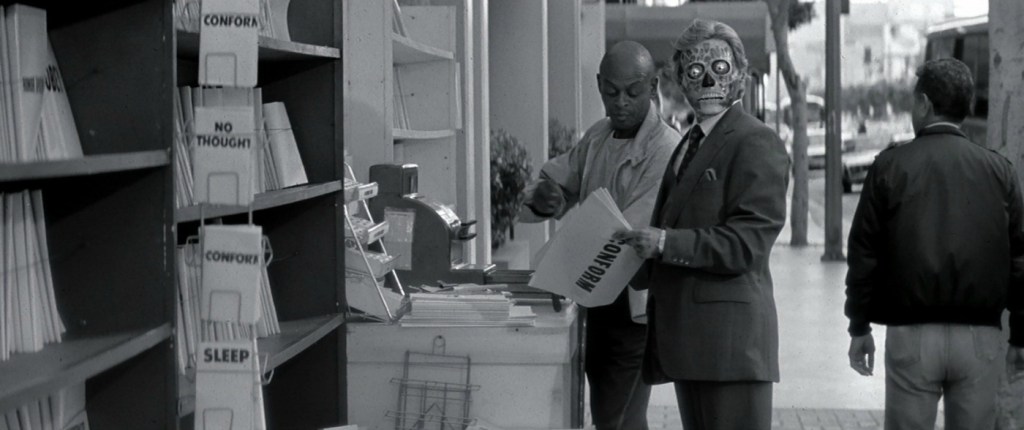 Para responder la pregunta anterior, es necesario hablar sobre un breve resumen de esta película, la cual nos cuenta la historia de John Nada (Roddy Piper) un vagabundo que llega a una gran ciudad en donde logra conseguir un trabajo que le da lo suficiente para sobrevivir a la dura vida en el lugar. Ahí es donde el protagonista descubre unas gafas de sol, con las que puede ver las verdaderas caras de la clase dominante, un grupo de extraterrestres que se dedicaba a lanzar mensajes subliminales a las personas comunes tales como “obedece, consume, reprodúcete y demás” a través de los medios masivos de comunicación. Ahora bien, cabe mencionar que esta cinta, es una fuerte crítica a los excesos del capitalismo y nos recuerda que siempre habrá un llamado a la rebelión ante el control que ejercen los grupos de poder.