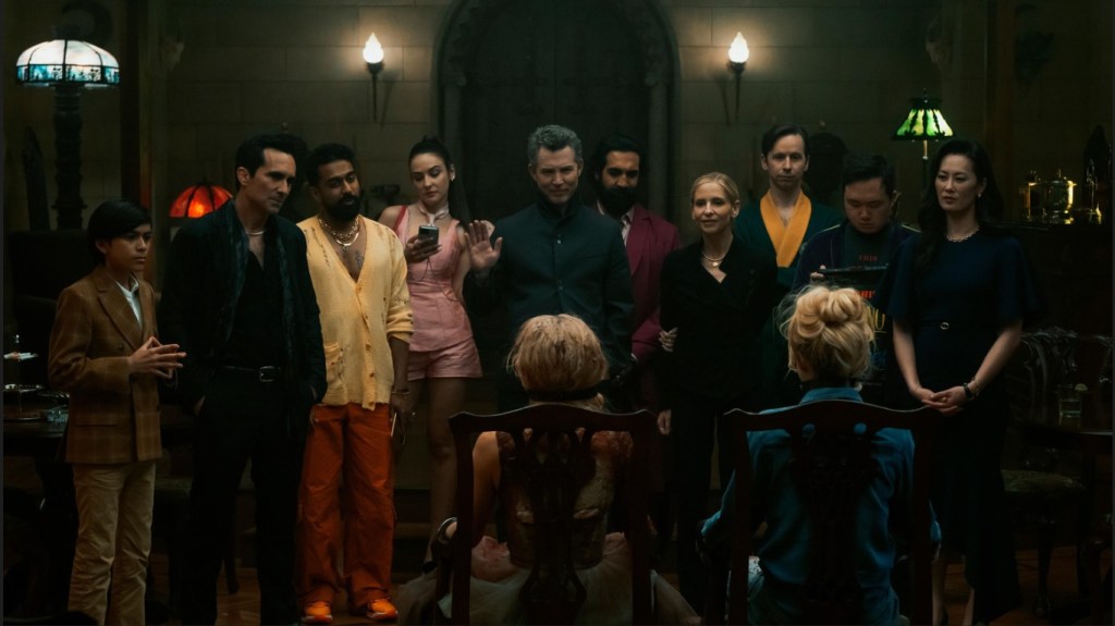 Los grandes sacrificados por las deficiencias de sus directores son Kathryn Newton, actriz con un carisma tan grande como cualquier pantalla y que no es ninguna novata en el género ni en el trabajo con ellos — véase su trabajo en una película como Freaky (C. Landon, 2020)—, pero que aquí es llevada a la caricatura de lo que busca ser un personaje humorístico, algo que también es notable en los trabajos de Kevin Durand con la dupla y quien afortunadamente tiene una participación muy corta en esta película. Otros ejemplos son los de Nestor Carbonell como otra caricatura que ni a farsa llega de un personaje español, Varun Saranga en un personaje que pareciera subestimar la inteligencia de la audiencia y otros actores pertenecientes a las familias elitistas que conforman el culto. Si hay algo en lo que Radio Silence tiene expertise de sobra como directores es en exhibir a sus actores.